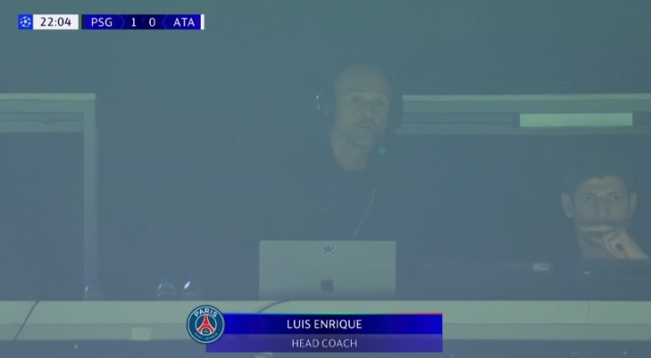自上周日对阵朗斯的比赛以来,恩里克便开始在媒体看台顶端的一个较为安静的角落观赛并进行指挥。他身边坐着三名视频分析师(文森特-布鲁内、昆汀-比利和安托万-吉洛坦)以及他的助教之一吉列姆-埃尔南德斯-福尔格拉。