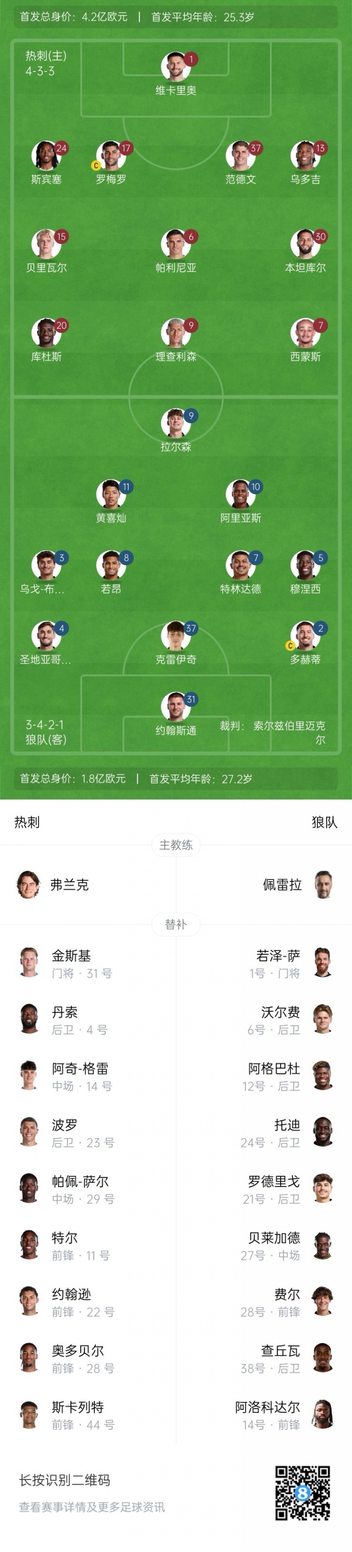 热刺vs狼队首发:西蒙斯、理查利森先发,罗梅罗、库杜斯出战